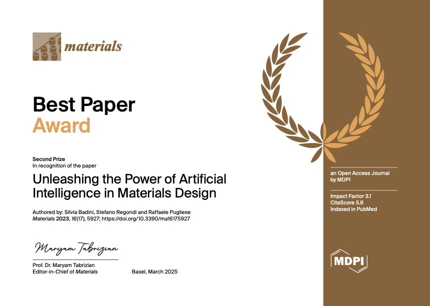 We are thrilled to share that our paper “Unleashing the power of artificial intelligence in Materials design” (https://lnkd.in/dPWCdyph) has been selected as a winner of the Materials MDPI 2025 Best Paper Awards!